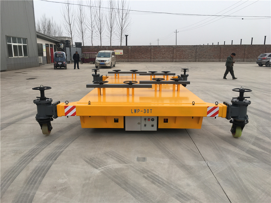 無軌膠輪運(yùn)輸車,載重30噸,可以按照實(shí)際載重需求定制加工,臺(tái)面夾具有效保護(hù)工件不會(huì)傾翻,臺(tái)面四周加裝可延伸輔助支撐輪,有效保護(hù)車體運(yùn)輸過程中的穩(wěn)定性。